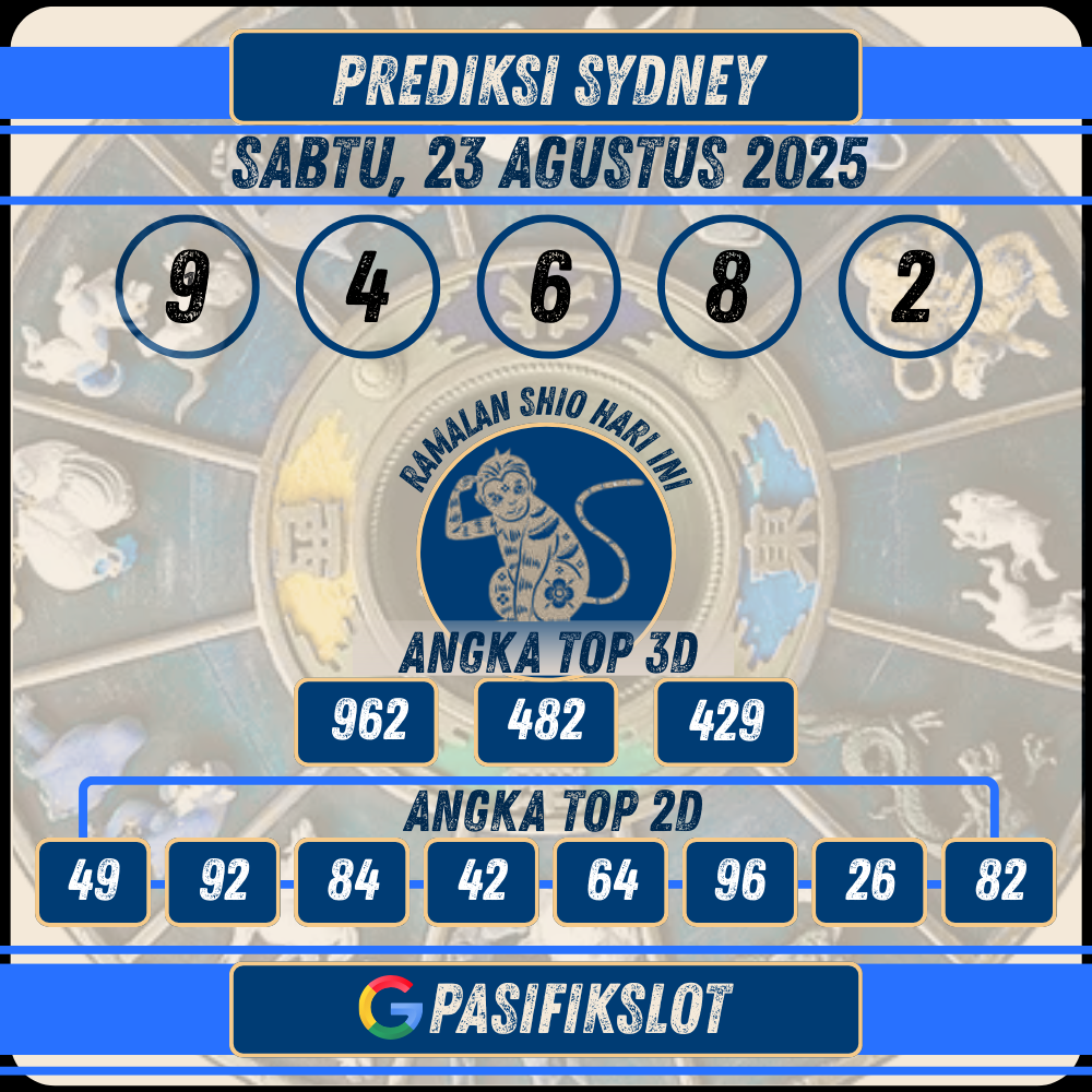 PASIFIKSLOT | Selamat datang di halaman prediksi togel sydneypools terbaru untuk tanggal 23 Agustus 2025. Kami di Pasifikslot selalu berusaha memberikan prediksi angka jitu yang akurat dan terpercaya untuk membantu Anda meraih kemenangan maksimal. Dengan analisis data keluaran sebelumnya dan pola angka, kami menyajikan angka-angka terbaik untuk Anda gunakan sebagai referensi taruhan.